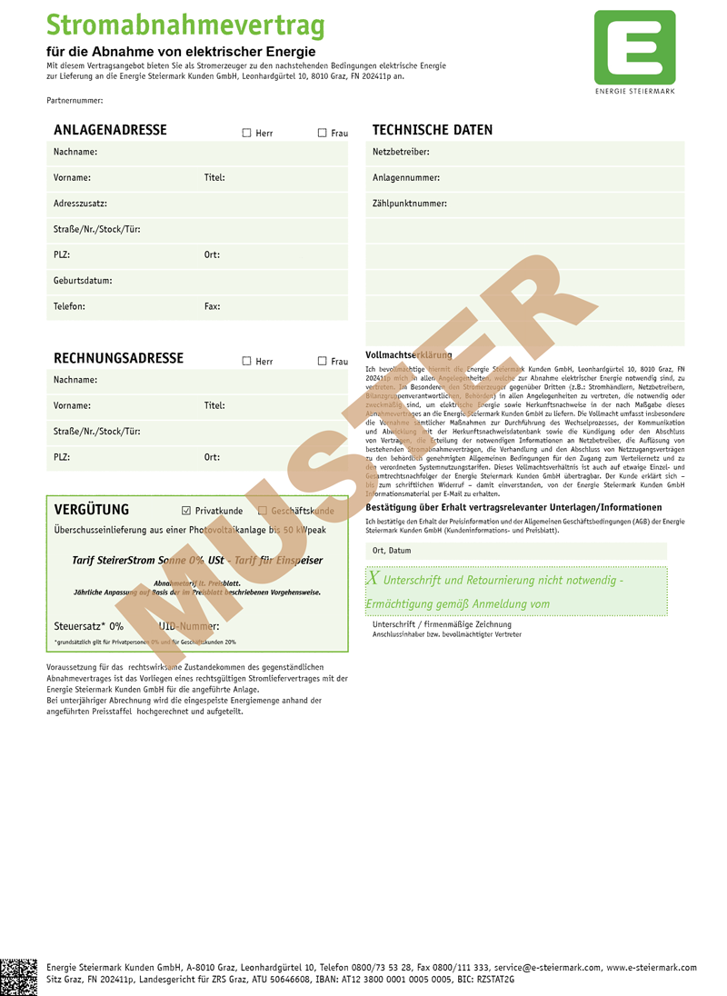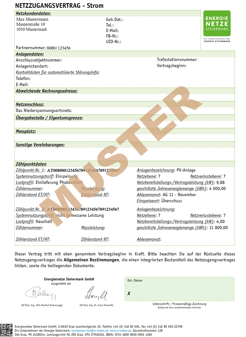 Die Ablehnung Ihres Antrags könnte mit Ihrem Netzbetreiber zusammenhängen, worauf wir als Energielieferant keinen Einfluss haben. Womöglich wurden die Daten von Ihrem Netzbetreiber nicht über den verpflichtenden Marktprozess an die österreichische Regulierungsbehörde (E-Control) gesendet, was die Ablehnung Ihres Antrags zur Folge hatte. In solchen Fällen wenden Sie sich bitte direkt an Ihren zuständigen Netzbetreiber. Falls Ihr Netzbetreiber weiterhin keine Daten an die E-Control übermittelt, stellen wir als freiwilligen Service untenstehendes Formular zur Verfügung. Dieses wird von uns an die E-Control übertragen. Die Zu- oder Absage Ihres Antrags erfolgt durch die E-Control und liegt außerhalb unseres Wirkungsbereichs. Wir bitten Sie dieses Formular vollständig und mit den korrekten Daten auszufüllen und anschließend zusammen mit Ihrem Netzzugangsvertrag (NZV) und dem Stromabnahmevertrag (SAV) hochzuladen. Den Netzzugangsvertrag erhalten Sie bei Ihrem zuständigen Netzbetreiber.