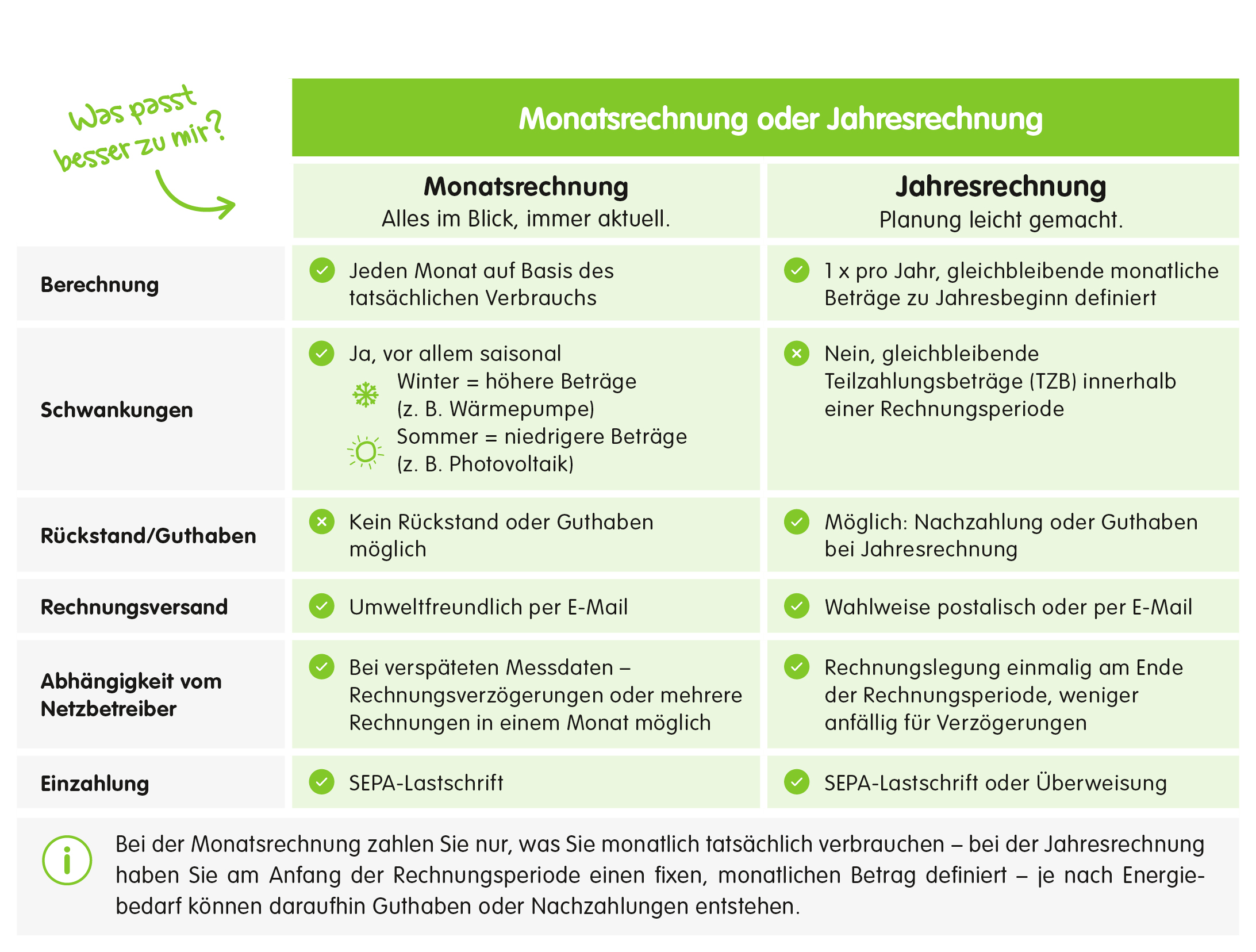 Bei der Monatsrechnung wird jeden Monat eine Rechnung auf Basis ihres tatsächlichen Stromverbrauchs angefertigt. Deswegen kann sie aufgrund von saisonalen Schwankungen niedriger oder höher ausfallen. Der monatliche Rechnungsbetrag kann zum Beispiel beim Betrieb einer Wärmepumpe im Winter höher oder beim Nutzen einer Photovoltaikanlage im Sommer niedriger sein. Damit unterscheidet sie sich grundlegend von der Jahresrechnung, bei der monatlich gleich hohe Teilzahlungsbeträge im Vorhinein vereinbart werden. Dadurch kann bei der Jahresrechnung am Ende der Rechnungsperiode ein Rückstand bzw. ein Guthaben entstehen. Bei der Monatsrechnung kann dies aufgrund der verbrauchsabhängigen, monatlichen Abrechnung nicht passieren.
