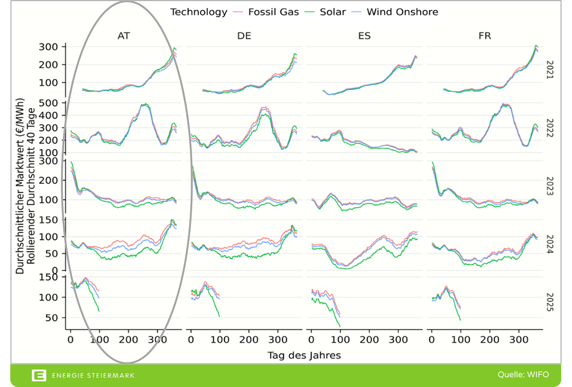 Abbildung 2: Marktwert: Technologien wie Photovoltaik, die an wenigen Stunden pro Tag mit hoher Saisonalität einspeisen, verlieren bei verstärktem Zubau an Wert, WIFO, 2025
