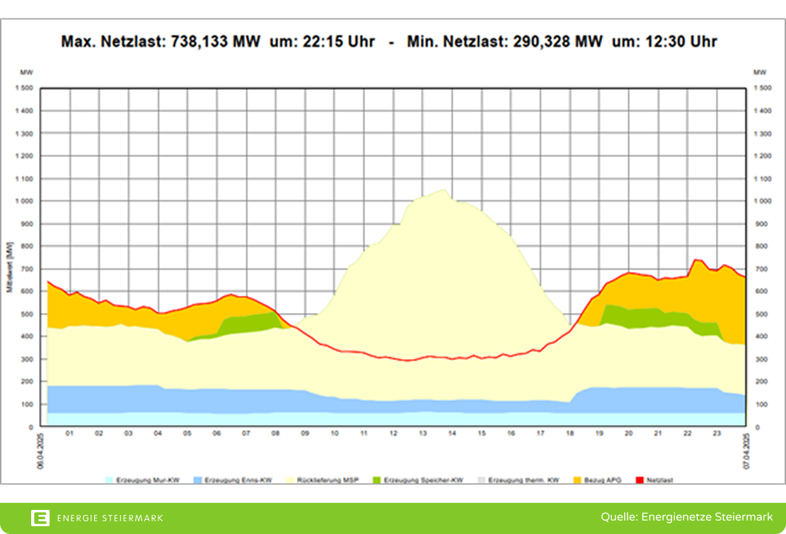 Zwischen 8 Uhr und 18 Uhr übersteigt dann die erzeugte Strommenge den lokalen Bedarf (Netzlast). Diese Menge muss wiederum in die nächsthöhere Netzebene (Übertragungsnetz der APG) verschoben werden. Wird die Strommenge nicht innerhalb Österreichs verbraucht, gelangt sie ins europäische Stromverbundsystem (Stromexport).