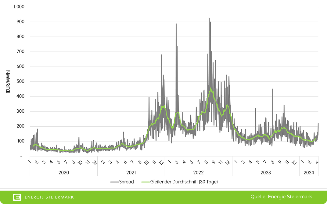 Abbildung 3: Preis-Spreads zwischen Herbst 2021 und Frühjahr 2023, Energie Steiermark