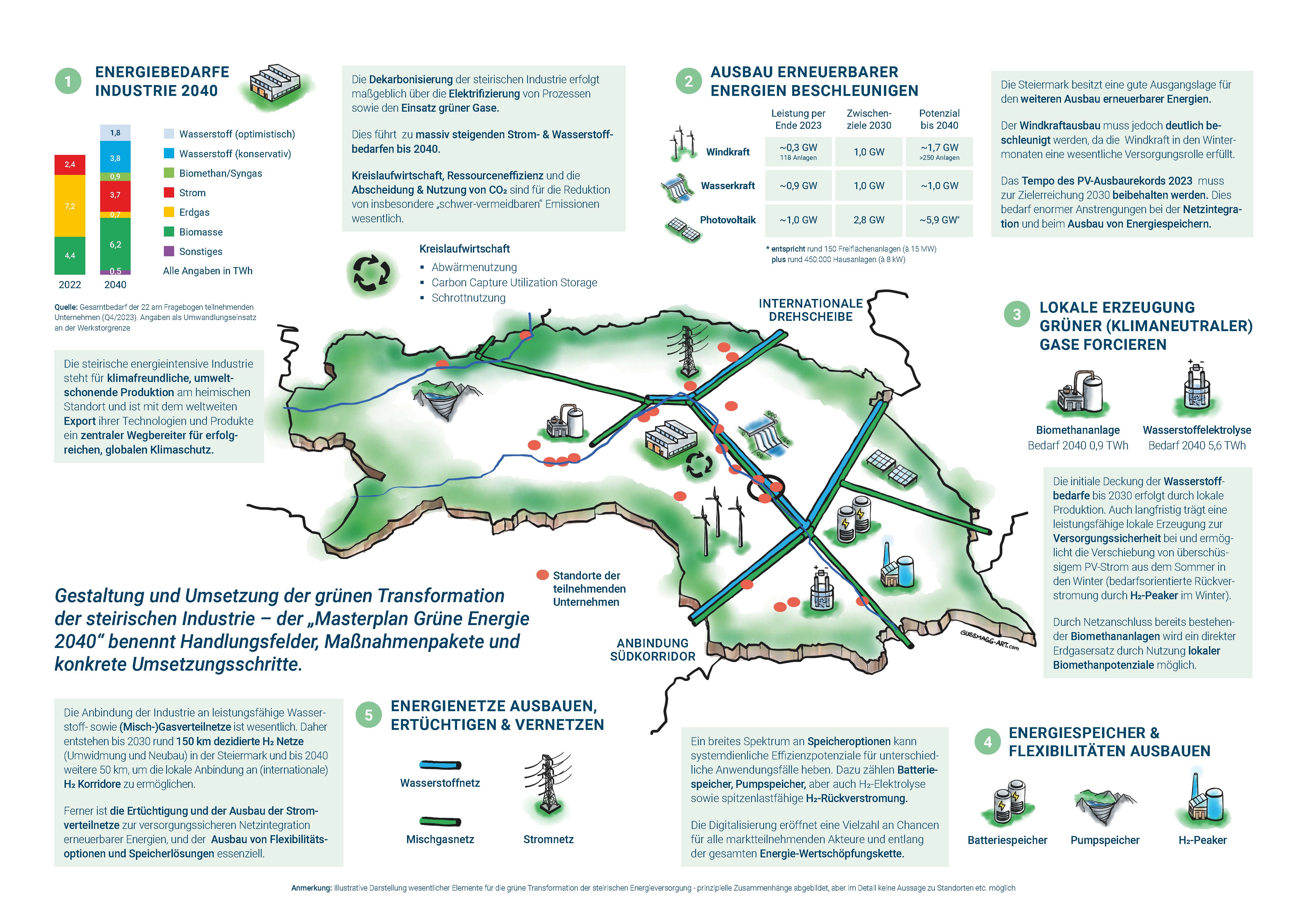 Die Energie Steiermark und die Industriellenvereinigung Steiermark arbeiteten in Kooperation mit den Top-22 Industriebetrieben seit Herbst 2023 an einem Masterplan für die grüne Transformation der energieintensiven Industrie. Im Fokus der umfangreichen Datenerhebungen und fünf Workshops stand die Dekarbonisierung der industriellen Energieversorgung. Im nunmehr vorliegenden Masterplan werden Handlungsfelder und Maßnahmenpakete für die grüne Transformation der steirischen Industrie klar benannt und für Entscheidungsträger:innen verständlich erläutert sowie visuell aufbereitet.