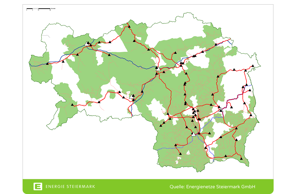 Die Abbildung zeigt das Stromnetz (in rot Hoch- und Mittelspannungsnetz) und das Versorgungsgebiet (grün hinterlegt) der Energienetze Steiermark GmbH, die Umspannwerke (schwarze Dreiecke) sowie APG-Übergabestellen (weiße Dreiecke) zum Übertragungsnetz der APG (blau). Konkrete Projekte für Ihre Region finden Sie im 2024 erstmals in diesem Detaillierungsgrad veröffentlichten Netzentwicklungplan der Energienetze Steiermark.